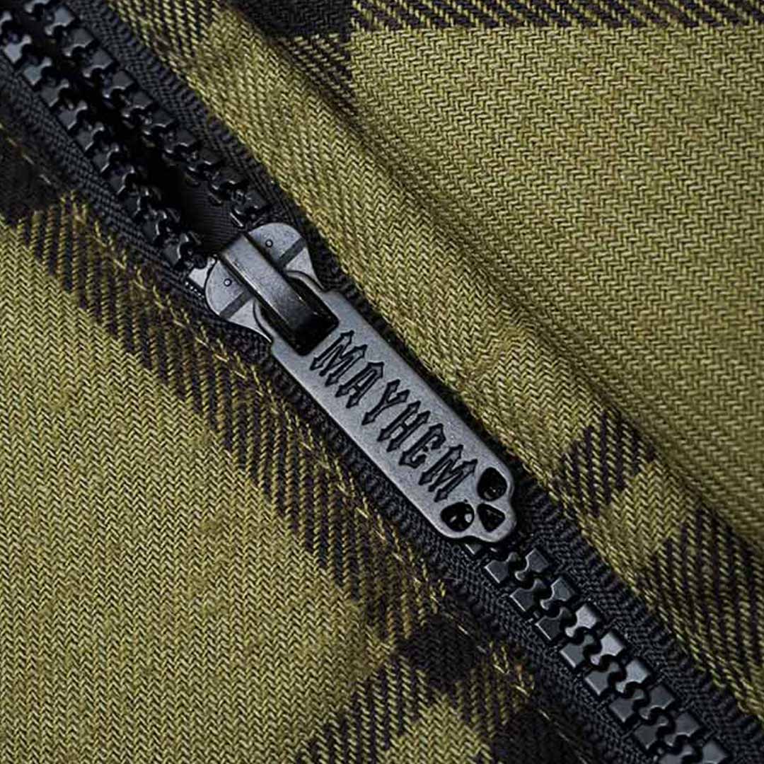 Unsere Flanelljacken in klassischem Karo-Muster ist nicht nur funktional, sondern auch ein echter Hingucker. Mit gestickten Motiven, Druckknöpfen mit Schädel-Design und einer zusätzlichen Knopfleiste mit Mayhem Skull Zipper setzen wir auf Liebe zum Detail. Die Jacke verfügt über seitliche Reißverschlusstaschen und eine Innentasche mit Knopf, sodass du all deine wichtigen Dinge sicher verstauen kannst.