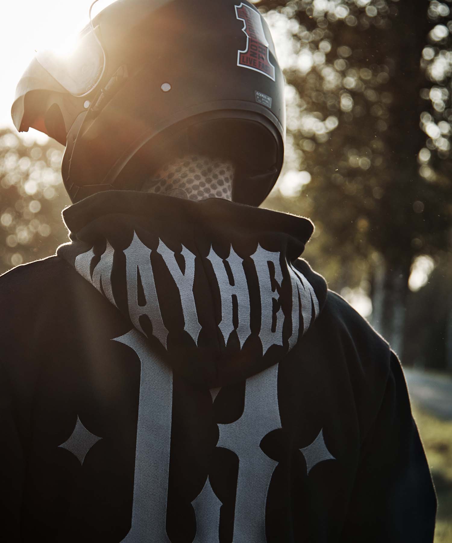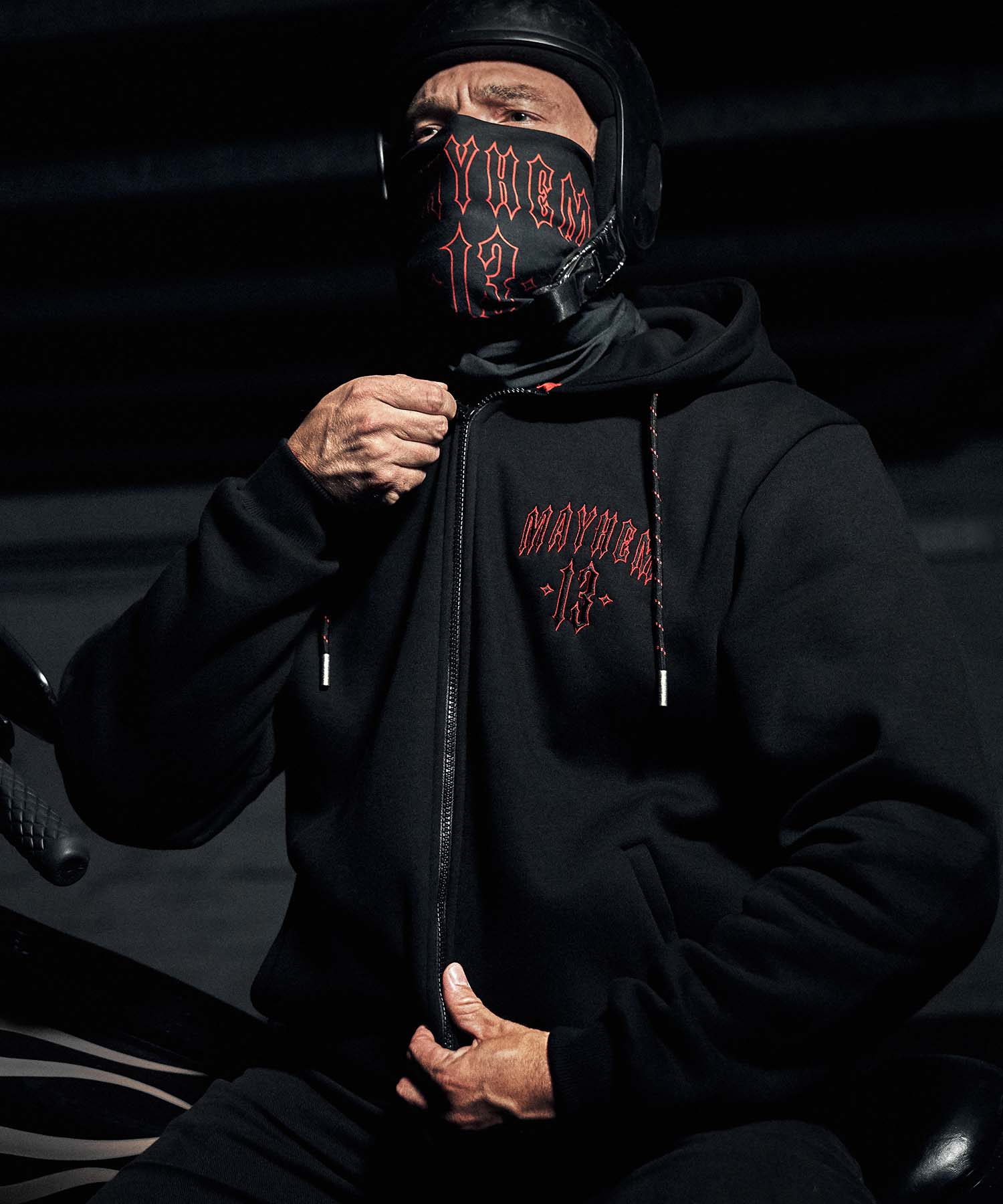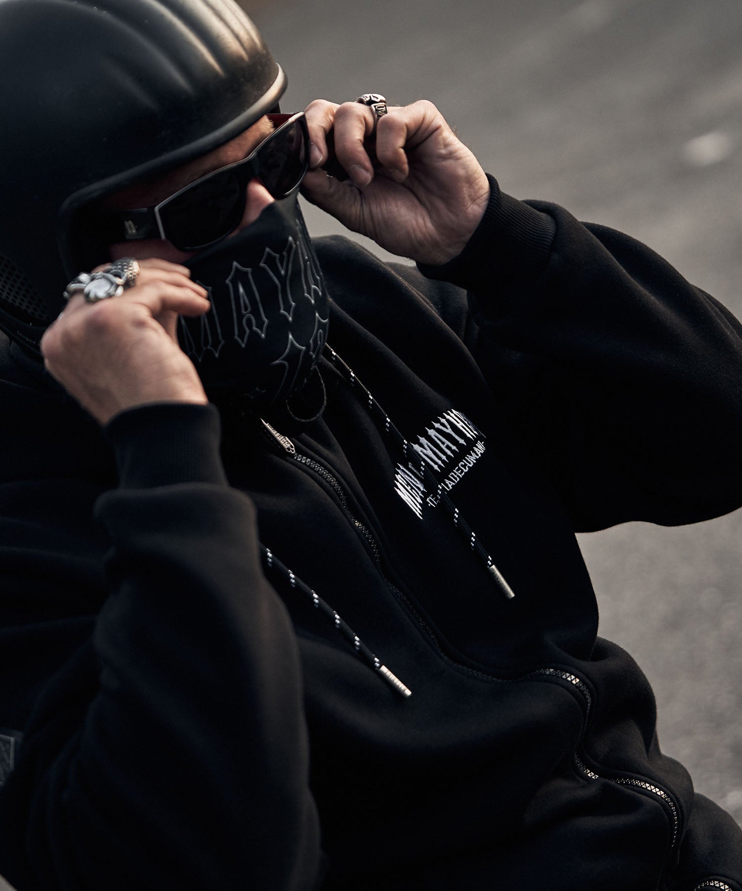It's all about the details: Unsere Hoody Jacken sind mit gesticktem Logo, Mayhem Schriftzug und geprägten Metallkappen.