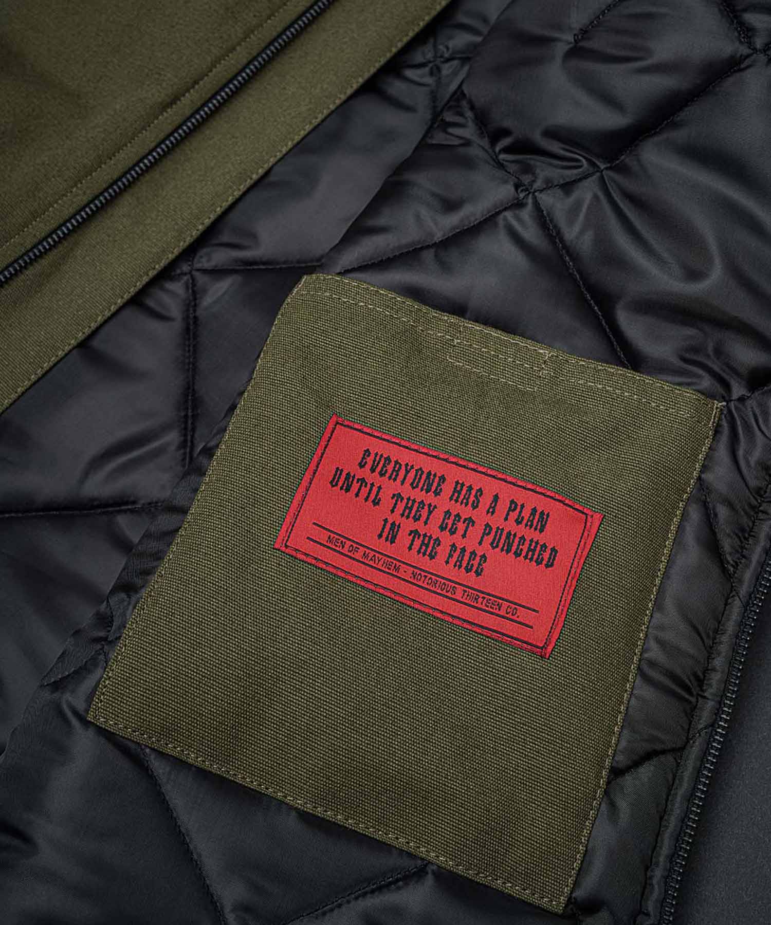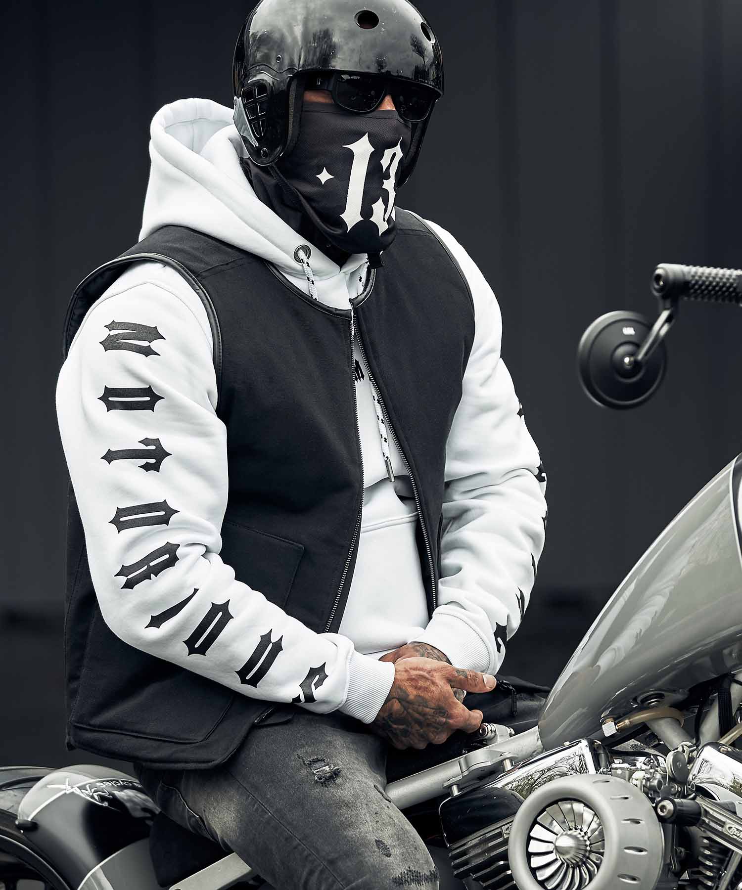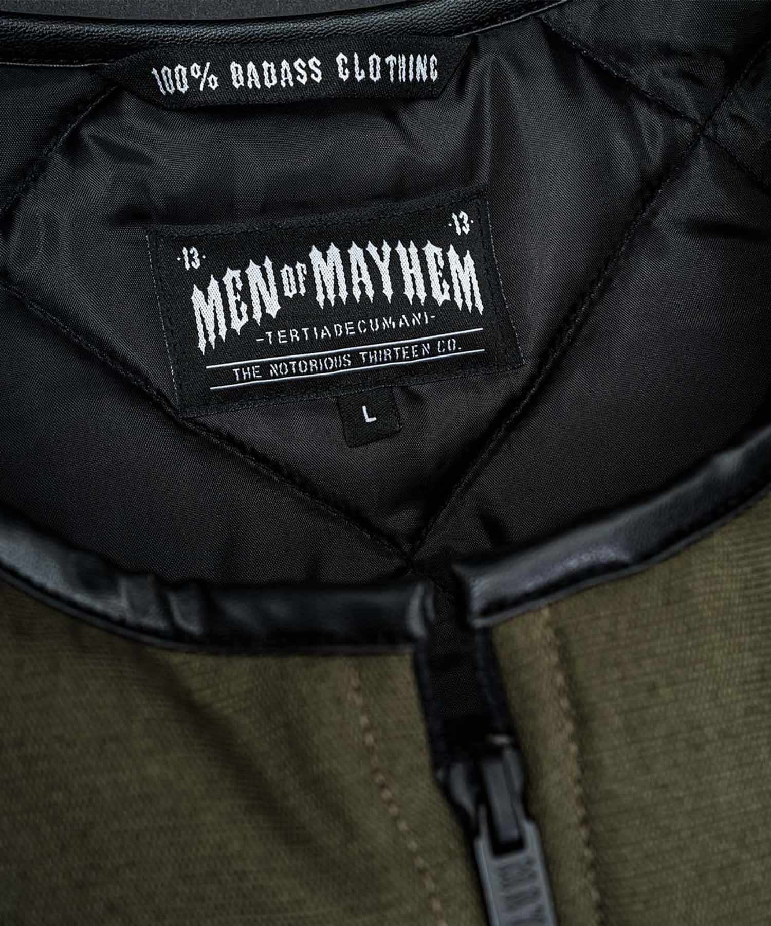 Die Weste ist nicht nur robust, sondern auch äußerst praktisch ausgestattet. Mit2 Außentaschen und 2 Innentaschen mit Klettverschluss bietet sie ausreichend Stauraum für deine persönlichen Gegenstände. Der Mayhem Skull Zipper verleiht der Weste einen markanten Look. Die angebrachte Raute mit der 13 Prägung ist aus Metall gefertigt.