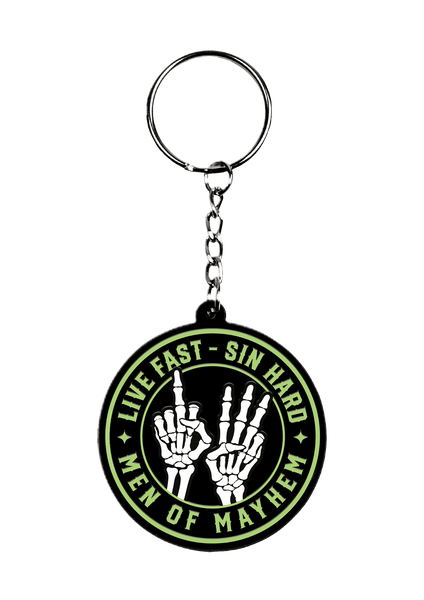Bonehands L.F.S.H. pendant featuring two skeletal hands forming the 13 – surrounded by LIVE FAST – SIN HARD and MEN OF MAYHEM.