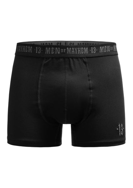 Our form-fitting boxers are subtly embroidered with a 13. The fabric is elastic, pleasantly soft, and gentle on the family jewels. Featuring an elastic waistband with our Men of Mayhem logo woven in.