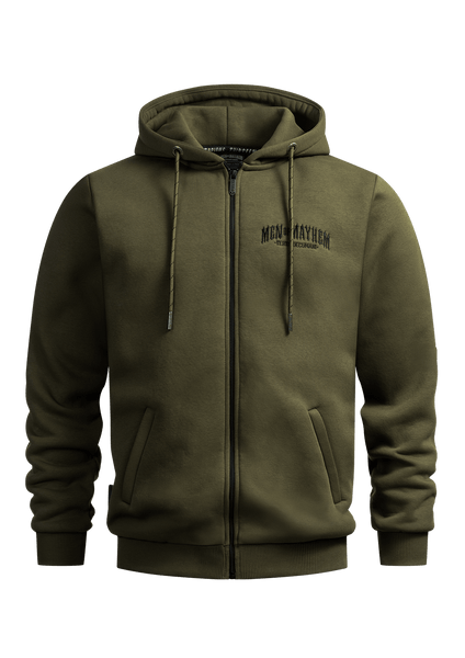 Our classic Men of Mayhem logo is embroidered on the chest, while a large 13 is embroidered on the back of the hoodie jacket. Additionally, the hood features large „MAYHEM“ lettering, which is also embroidered.