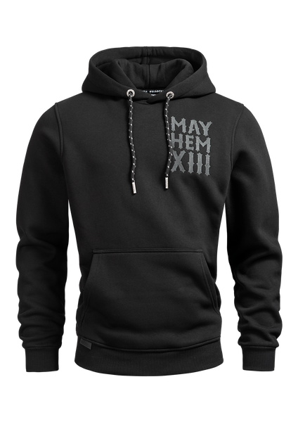 The MK3 version of our Chopper hoodie features a number of details: The „MAYHEM XIII“ lettering on the chest is fully embroidered, while the back motif is attached to the hoodie jacket as sewn patches. Also, the hoodie strings give it a sporty look and have embossed metal caps at the ends. There is an inside pocket in the kangaroo pocket, which is also equipped with a zipper.