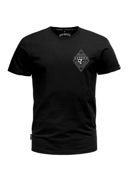 Our Savages T-shirt captivates with the diamond print on the chest and back. The Men of Mayhem diamond on the chest is small, the motif on the back distinctive.