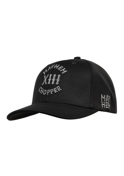 Onze Mayhem Chopper-basecap is de perfecte aanvulling op onze bekende Chopper-shirts en hoodies. De pet heeft een gebogen klep en een verstelbare snapbacksluiting. Daarnaast hebben we een elastische band geïntegreerd zodat je hem eenvoudig aan elke tussenmaat kunt aanpassen en de pasvorm naar wens kunt instellen. Alle motieven op de cap zijn geborduurd.