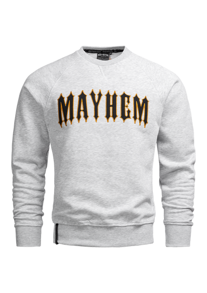 Onze Crewneck Mayhem in lichtgrijs gemêléerd / marine-goud valt op door de grote 'MAYHEM'-applicatie op de borst. De applicatie heeft een subtiele omlijning die de crewneck een unieke uitstraling geeft.