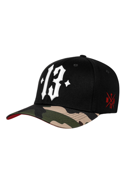 Onze Men of Mayhem Flex Cap heeft een elastische band aan de achterkant voor een supercomfortabele pasvorm. Het witte 13‑3D‑borduursel op het voorpaneel valt bijzonder op. Alle andere motieven op de cap zijn eveneens geborduurd; de klep is in camouflage uitgevoerd en gebogen.