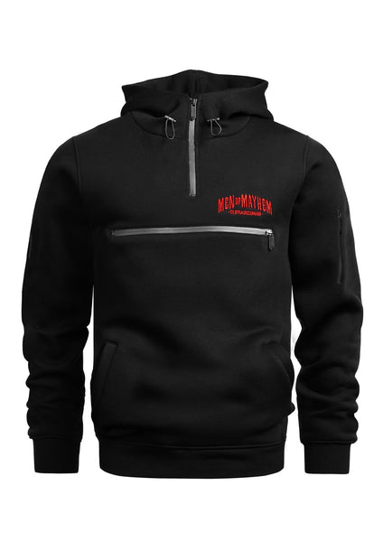 De hoodie valt op door de subtiele logoborduring op de borst en de geborduurde 13 in de nek. Bovendien is er een PVC Mayhem-vlag bevestigd aan de mouw.