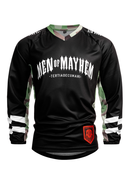 Onze Mayhem Classic S/C‑jersey heeft bijzondere Men‑of‑Mayhem‑details. De basis is zwart, gecombineerd met camouflage zijpanelen en mouwen en een contrasterende V‑hals in camo. De witte logo's op de donkere stof zorgen voor een krachtig contrast. Het honingraatvormige materiaal is niet alleen een visuele highlight, maar ook zeer licht en ademend. Deze kwaliteiten maken dit jersey tot de ideale metgezel voor je volgende rit – op de weg of offroad. De zijpanelen zijn voorzien van extra mesh‑inzetstukken voor optimale luchtcirculatie en ventilatie, ook op hete dagen. Dankzij het sublimatieprintproces blijven de kleuren langdurig helder en ondoorzichtig, zelfs na talrijke wasbeurten.