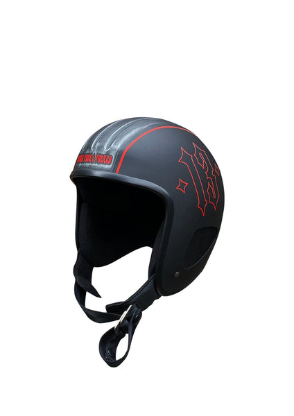 Onze MEN OF MAYHEM-jethelm is gebaseerd op de Scorpion Titan half‑shell helm van glasvezel. De zwarte helm heeft een handgeschilderde rode MEN OF MAYHEM 13-laklaag, waardoor elk exemplaar uniek is. Voorop prijkt het „Never Fuck A Fucker”-logo, op de zijkanten een grote 13 en op de achterkant een groot MEN OF MAYHEM-logo. De subtiele ‘used’‑look rondt het ontwerp af en verbergt kleine krassen. De binnenvoering is zwart, gemaakt van polyester en kan worden gewassen.
