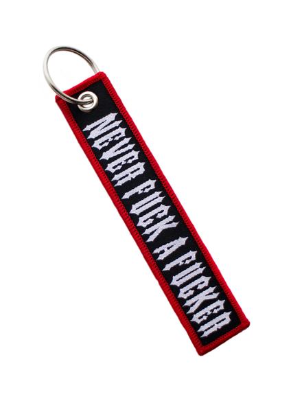 De perfecte hanger voor elke sleutelbos! Of hij nu aan je motor-, auto- of huissleutel bungelt – de boodschap is duidelijk. De sleutelhanger is aan beide zijden voorzien van geweven tekst ("NEVER FUCK A FUCKER" en "MEN OF MAYHEM"). Afmetingen: 13×2,5 cm plus ring.