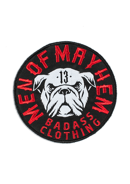 Geborduurde en geweven Badass Bulldog patch met zwarte rand om op te naaien. Afmeting: 11 cm