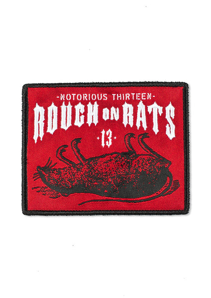 Geborduurde en geweven Rough on Rats patch met zwarte rand om op te naaien.
