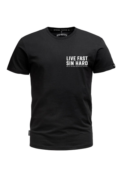 - “LIVE FAST SIN HARD” op de borst