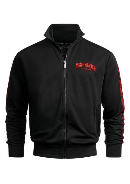Onze trainingsjacks hebben een geborduurd Men of Mayhem‑logo op de borst en een geborduurde 13 in de nek. Extra banden met ingeweven logo’s lopen over de mouwen.