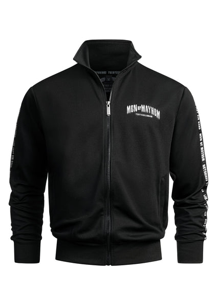 Onze trainingsjacks hebben een geborduurd Men of Mayhem‑logo op de borst en een geborduurde 13 in de nek. Extra banden met ingeweven logo’s lopen over de mouwen.