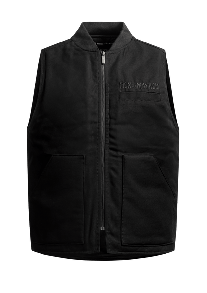 Onze Blacktop-jas is uitgevoerd in diepzwart canvas met een gewatteerde voering. Een verticale borstzak met rits en twee zijzakken zorgen voor praktische opbergruimte. Op de borst pronkt een ton-sur-ton Men of Mayhem-borduursel voor een cleane look.