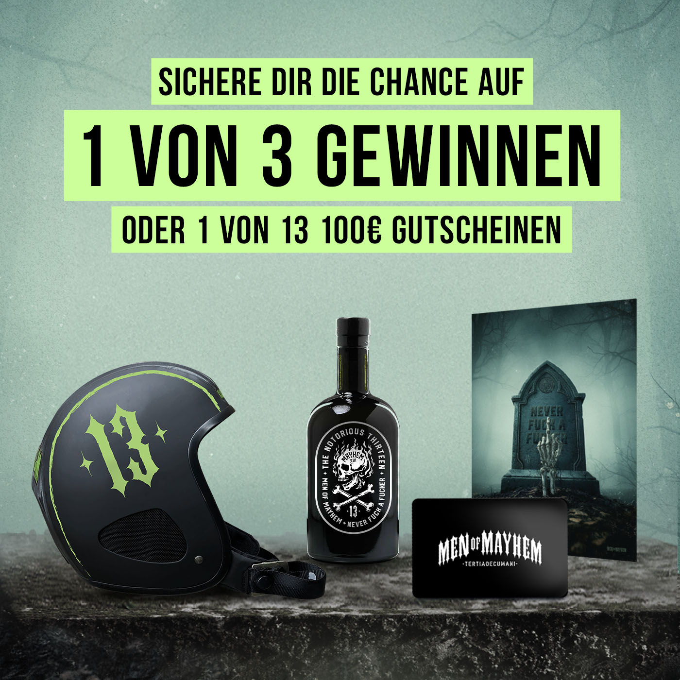 1 x 1 300€ Gutschein von MEN OF MAYHEM und dazu 1 x das N.F.A.F. Graveyard Poster in DIN A2 auf hochwertigem Papier gedruckt.