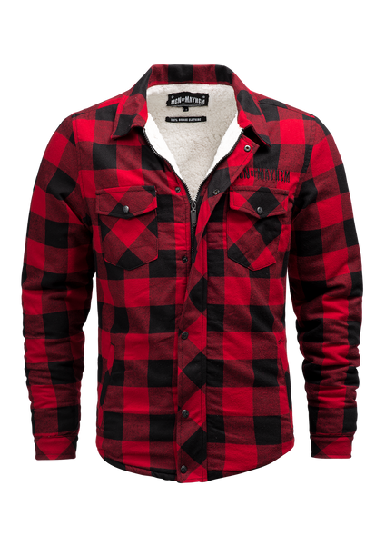 Die Redwood Flanell Jacke in schwarz/rot kariert. Die Jacke ist im Bereich des Torsos mit weißem Kunstfell gefüttert und in den Ärmeln mit einem glatten Stoff abgesteppt. Dies sorgt für einen höheren Tragekomfort und erleichtert das An- und Ausziehen der Jacke.