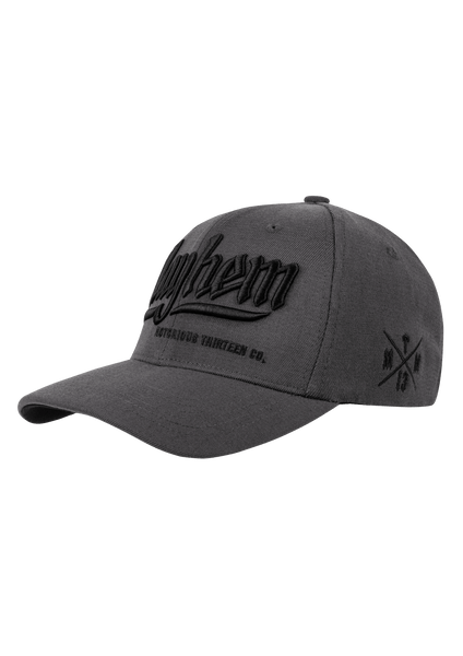 Mayhem Schriftzug als 3D Stick auf dem Frontpanel, Mayhem Cross an der Seite sowie der MEN OF MAYHEM Schriftzug an der Rückseite.