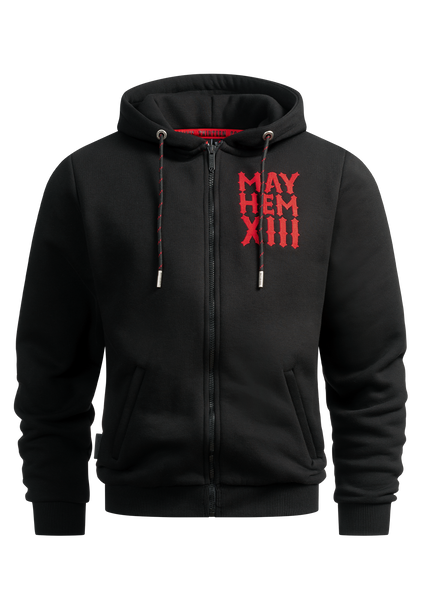 Der MAYHEM XIII Schriftzug auf der Brust ist komplett gestickt, das Rückenmotiv wurde in Form von vernähten Patches an die Hoodie Jacke angebracht.