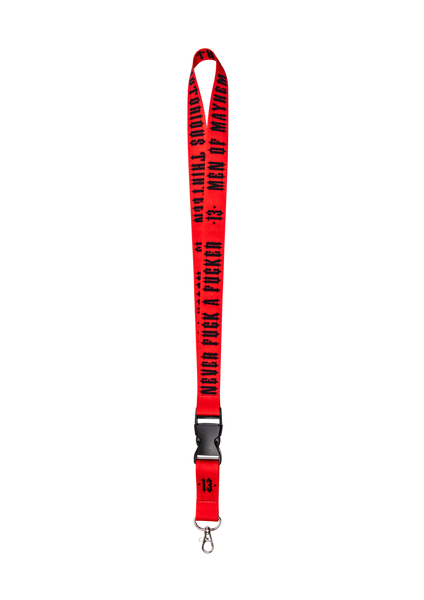 Men of Mayhem Lanyards sind doppelseitig und vollflächig bedruckt. Die 25mm breiten Schlüsselbänder bestehen aus 420 g/m² Satinband und zeichnen sich durch eine besonders hohe Reißfestigkeit aus. Am Ende der Lanyards befindet sich ein Haken, um Schlüssel, Karten oder ähnliches zu befestigen, sowie ein zusätzlicher Schnappverschluss für leichtes An- und Abstecken des Schlüssels.
