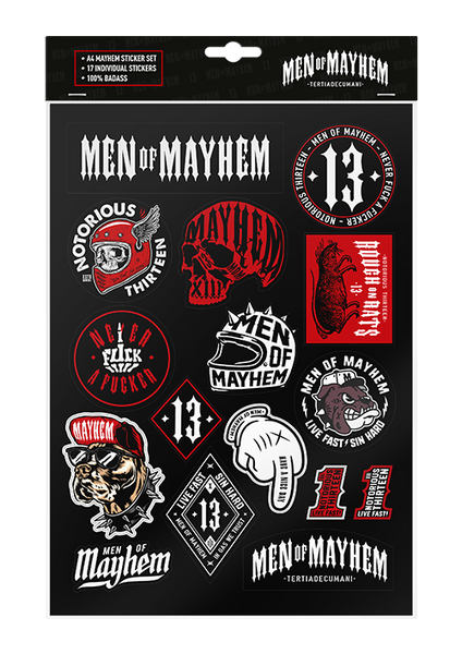 Unser Set enthält eine Vielzahl von Designs, darunter unsere markante Raute, den Middle Finger, das MEN OF MAYHEM Logo, das Rough on Rats Motiv und natürlich die 13, um nur einige zu nennen.