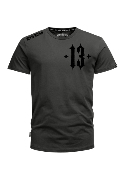 Das MEN OF MAYHEM Army Skull T-Shirt ist auf der Brust und dem Rücken bedruckt. Auf der Vorderseite befindet sich die 13 auf der Brust, auf der Rückseite der Army Skull. Der Schriftzug „Ride it like you stole it! Live fast, sin harder!“ rundet den Rücken-Print ab.