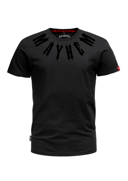 T-Shirt Mayhem B/B – auffällig durch den MAYHEM Schriftzug um den Hals, welcher schwarz auf schwarz gedruckt ist (black on black). Auf der Rückseite des T-Shirts ist ein großer 13 Print, ebenfalls Ton in Ton.