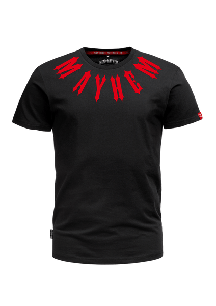 T-Shirt Mayhem S/R - auffällig durch den MAYHEM Schriftzug um den Hals.