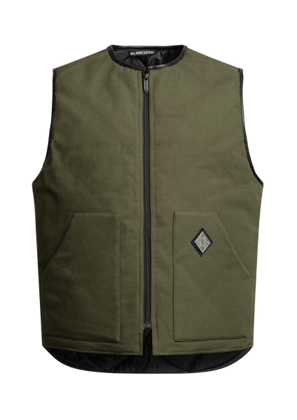 Gefertigt aus schwerem 100 % Baumwoll-Canvas mit gesteppter Innenseite, bringt diese Weste genau das Maß an Gewicht und Stabilität, das du für Alltag oder Ausfahrt brauchst. Der Kunstlederbesatz an Kragen und Armausschnitten unterstreicht den Look.