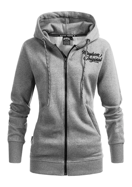 Auf der Brust ist der „Mayhem Originals“ Schriftzug gestickt, auf der Rückseite ist eine große gestickte 13. Die Kapuze ist zusätzlich mit einem „Two Words One Finger“ Stick versehen.